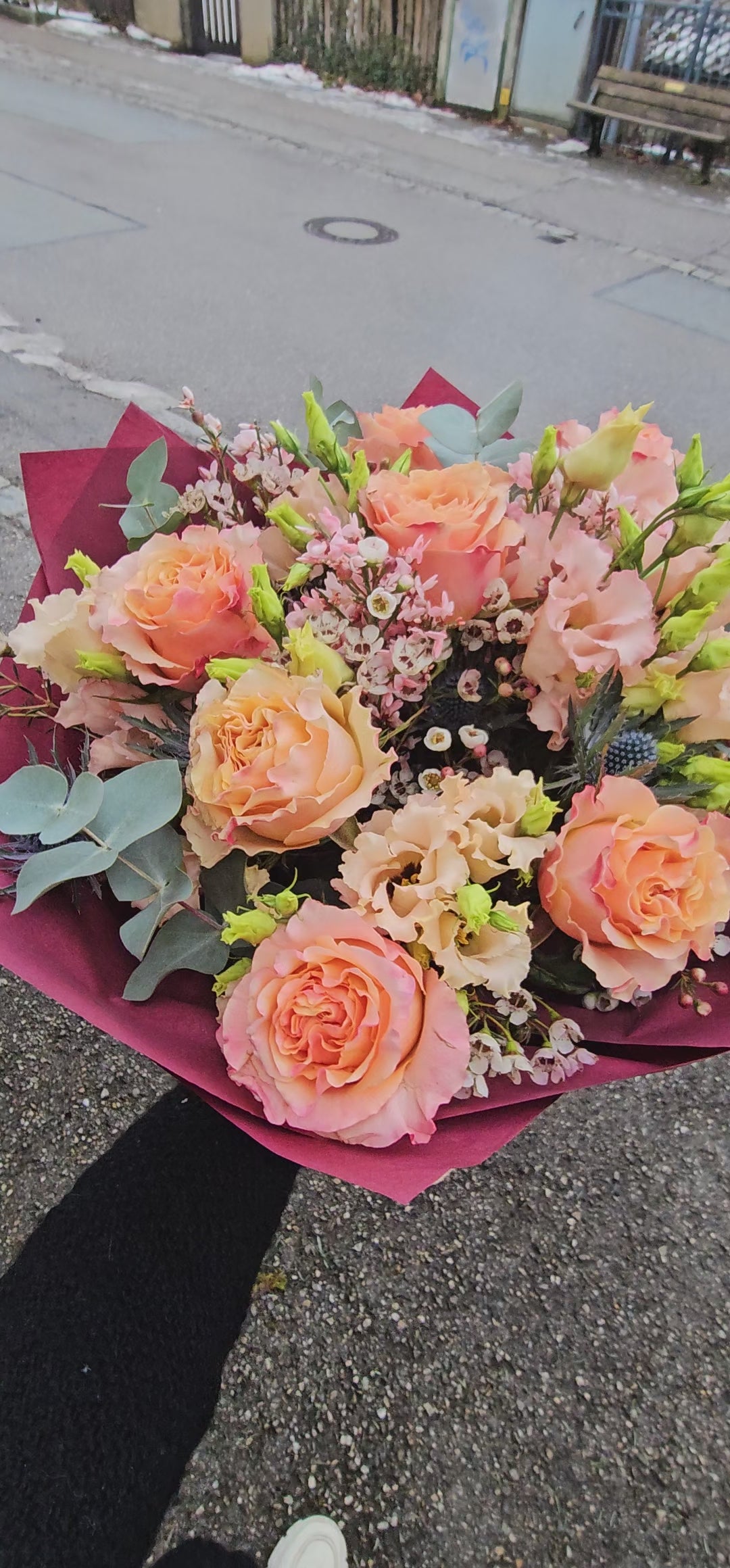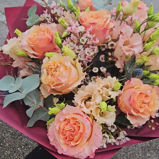 Ein warmer und romantischer Strauß mit prachtvollen Rosen in Aprikosen- und Pfirsichtönen, ergänzt durch zarte Lisianthus, verspielte Wachsblumen, distelartige Akzente (Eryngium) und silbrigen Eukalyptus. Die weinrote Verpackung bringt die Farben besonders edel zur Geltung.