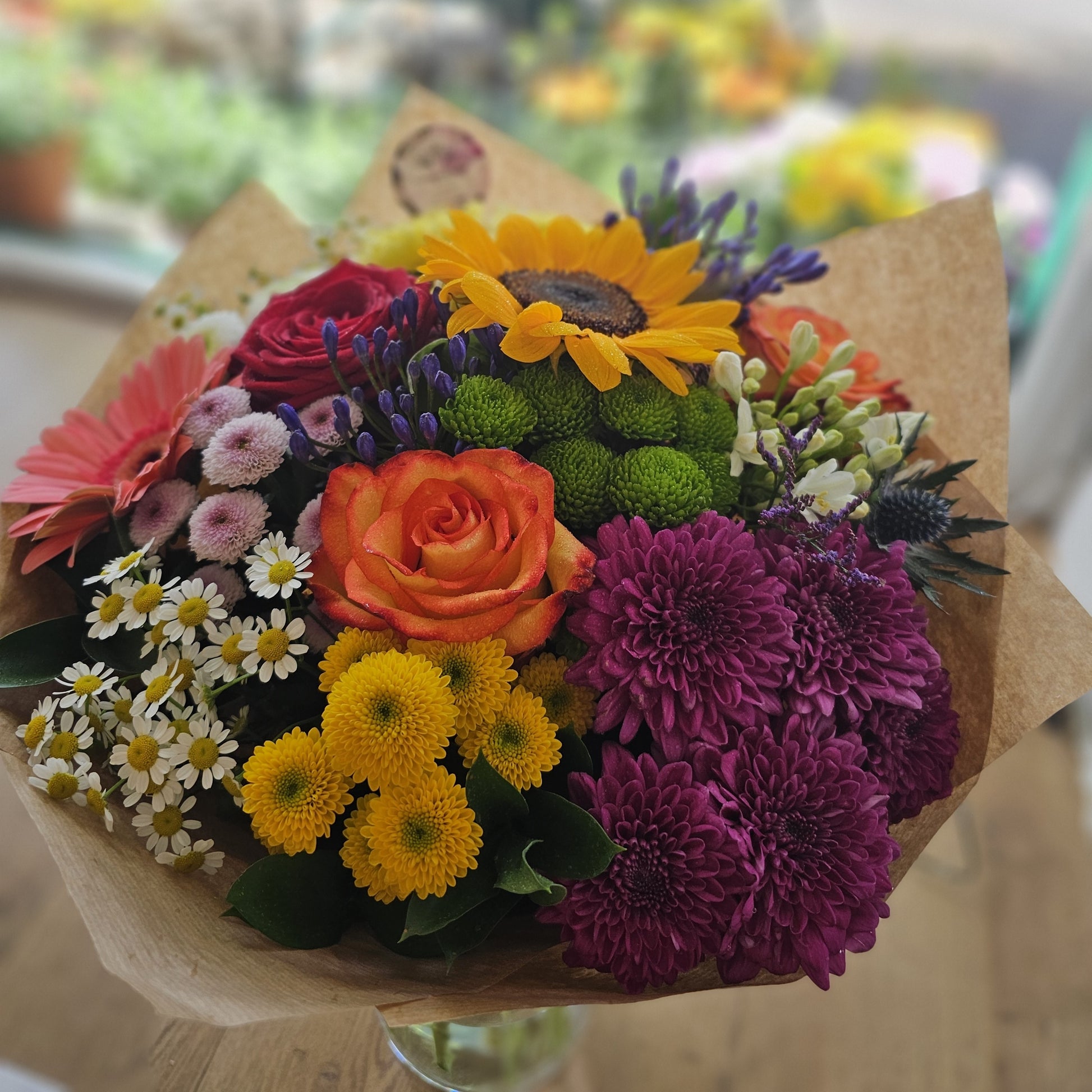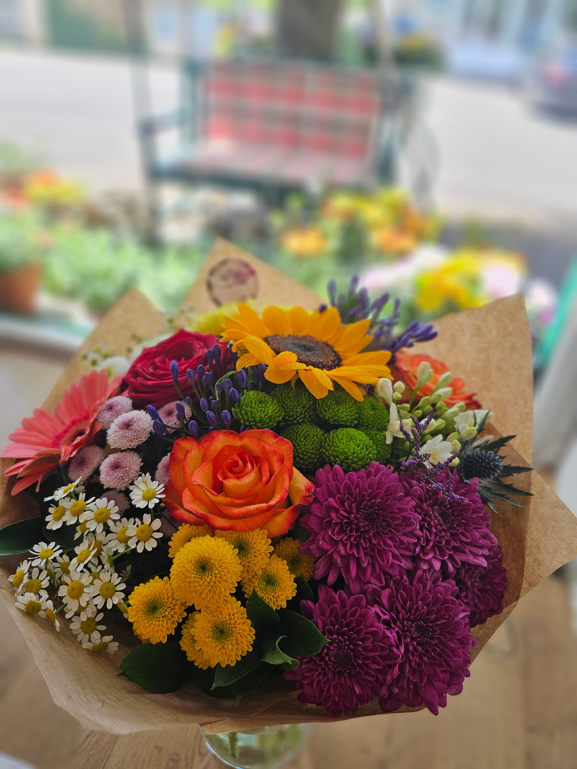 Ein strahlender Blumenstrauß, der die ganze Lebensfreude des Sommers in sich trägt. Leuchtende Sonnenblumen, orangefarbene Rosen und violette Chrysanthemen vereinen sich mit zarten Gerbera und verspielten Gänseblümchen zu einem farbenfrohen Ensemble. Frisches Grün rundet das Arrangement ab und sorgt für eine natürliche Leichtigkeit. Ob als Geburtstagsgruß, Dankeschön oder einfach so – dieser Strauß zaubert garantiert ein Lächeln ins Gesicht.