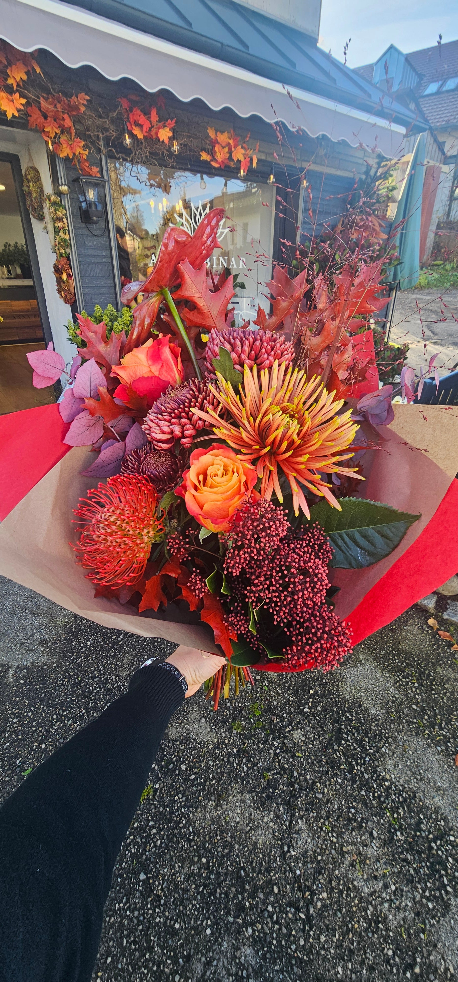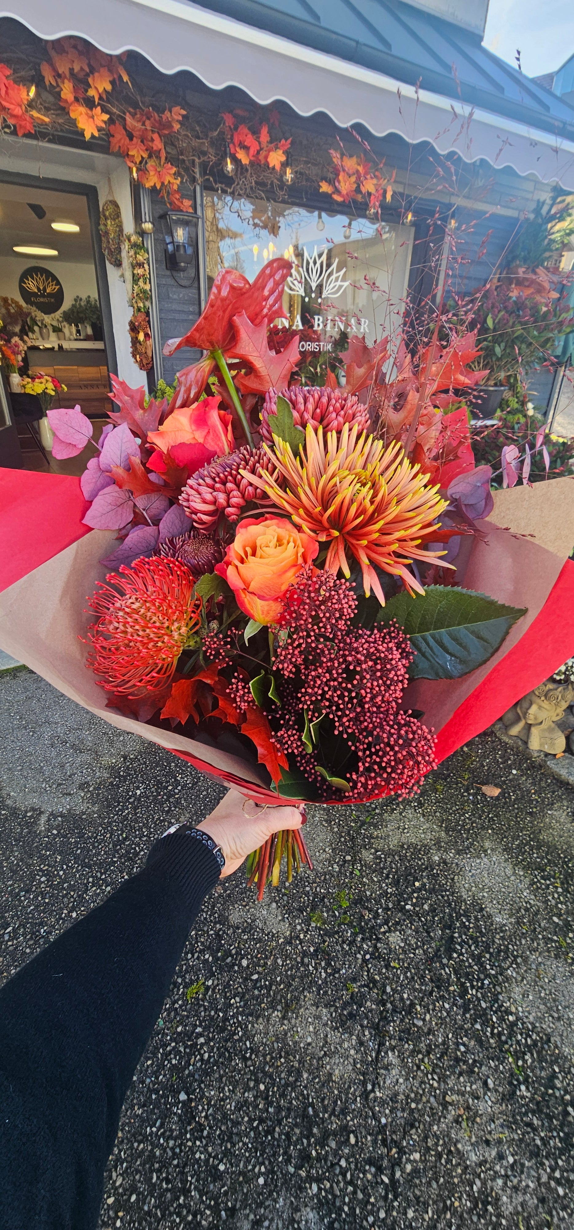 Ein ausdrucksstarker Herbststrauß voller Wärme und Tiefe. Kräftige Orange- und Rottöne verbinden sich mit außergewöhnlichen Blüten wie Protea, Spider-Chrysanthemen, Beeren und farbintensivem Laub. Dieser Strauß bringt das Leuchten des goldenen Herbstes direkt ins Zuhause und eignet sich perfekt als Geschenk für besondere Momente oder als beeindruckende Dekoration in der gemütlichen Jahreszeit.