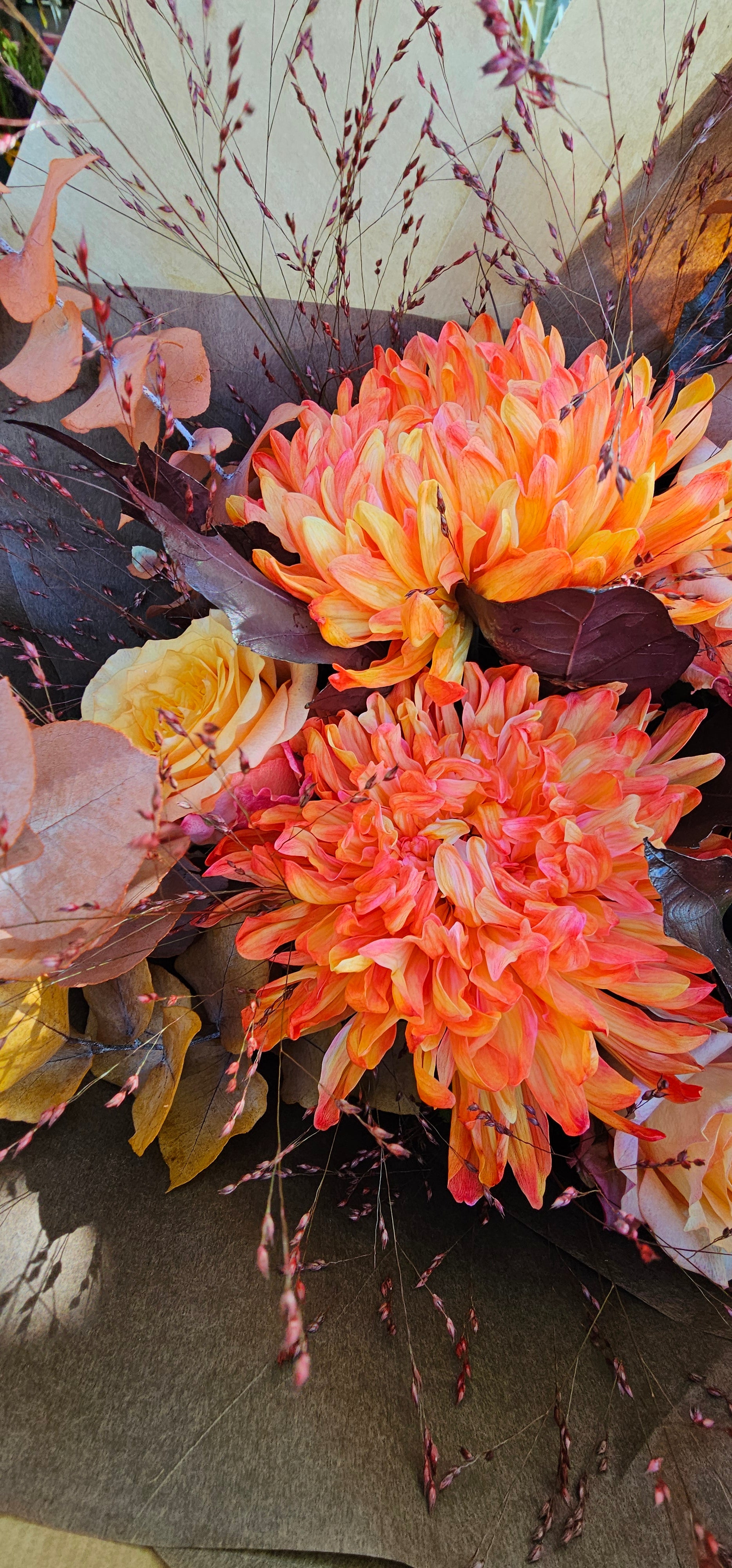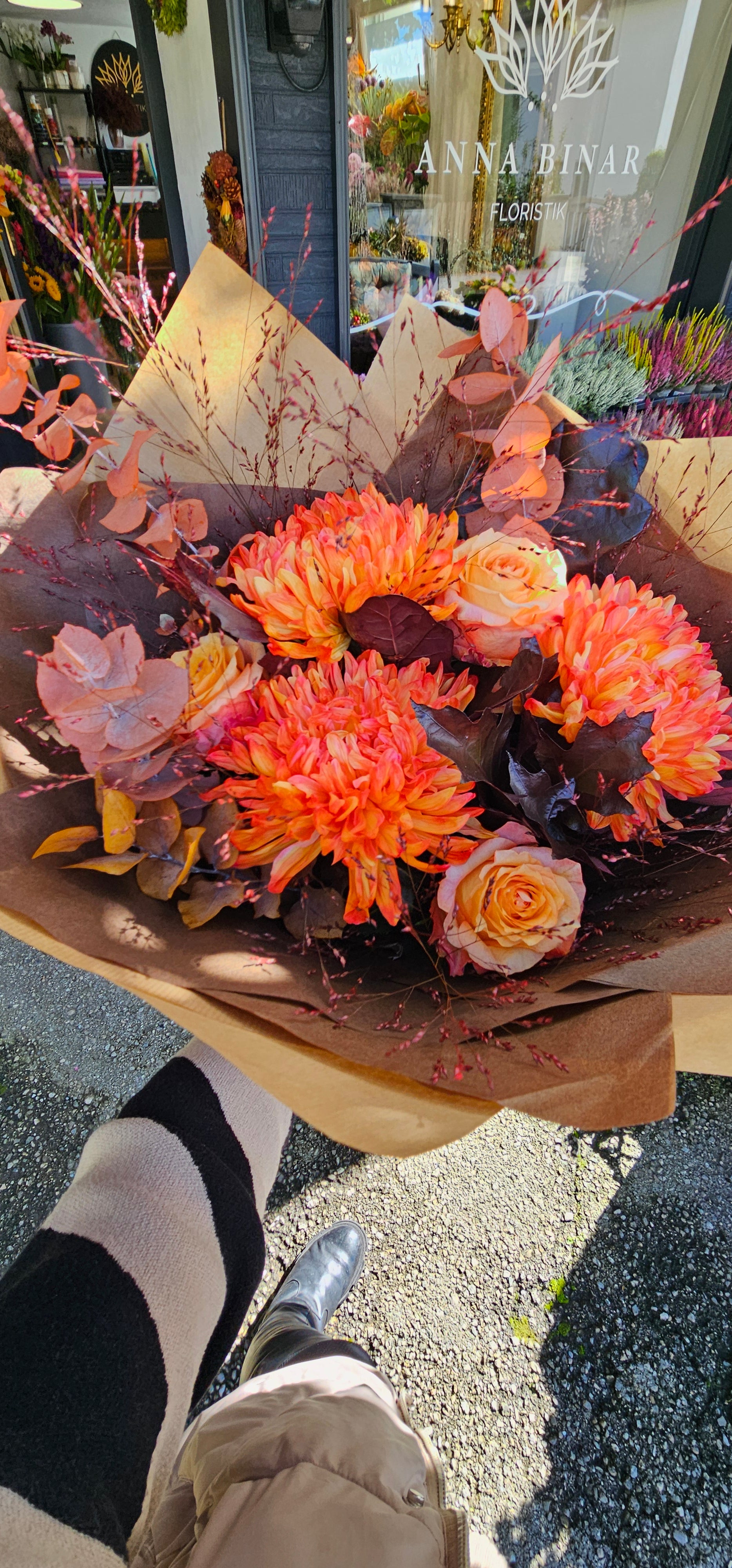 Ein warmer, herbstlicher Blumenstrauß mit leuchtend orangefarbenen Chrysanthemen und zarten Pfirsichrosen, umgeben von dunklem Eukalyptus und feinen Trockenblättern. Dieser Strauß strahlt Geborgenheit, Wärme und Eleganz aus – perfekt für den goldenen Herbst oder als ausdrucksvolles Geschenk.