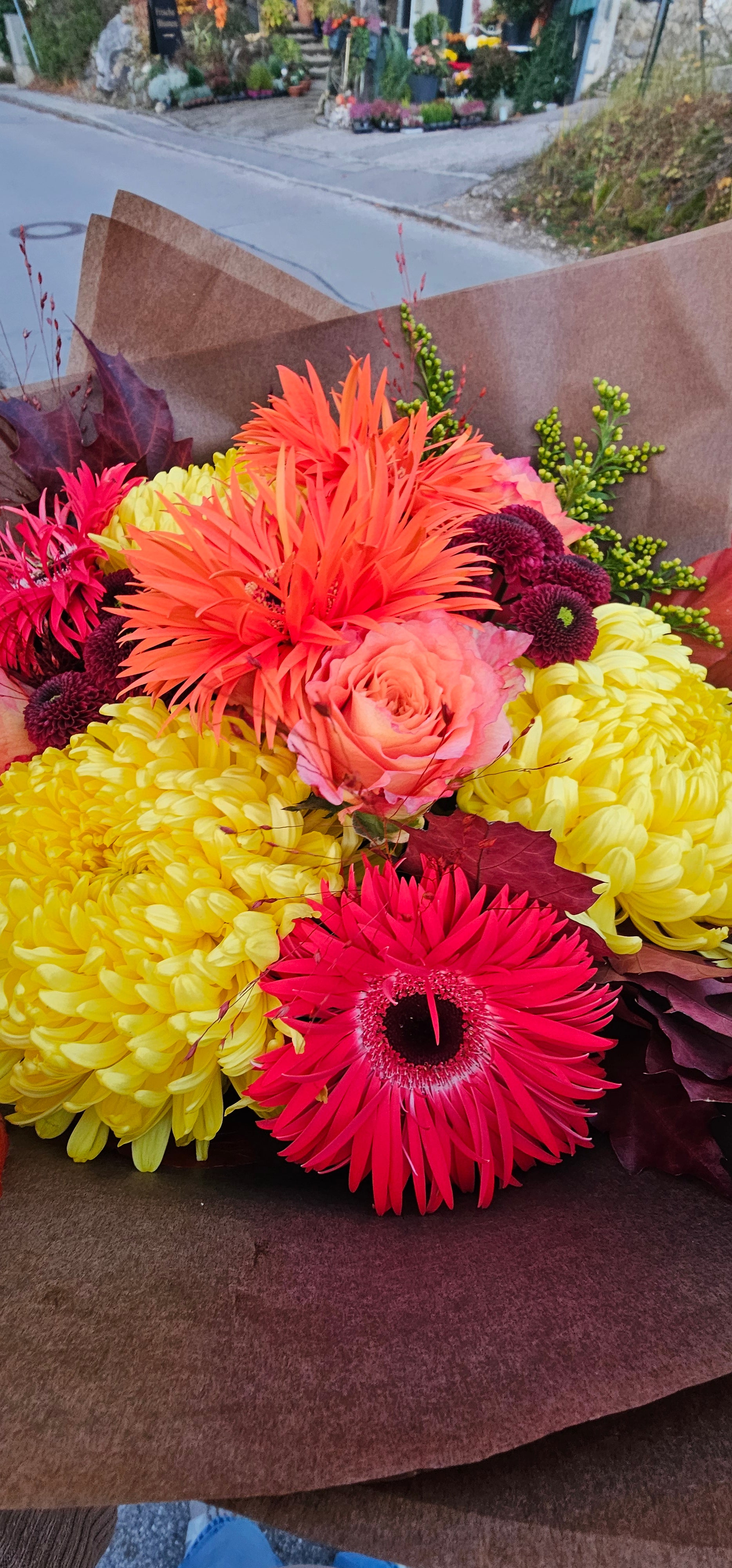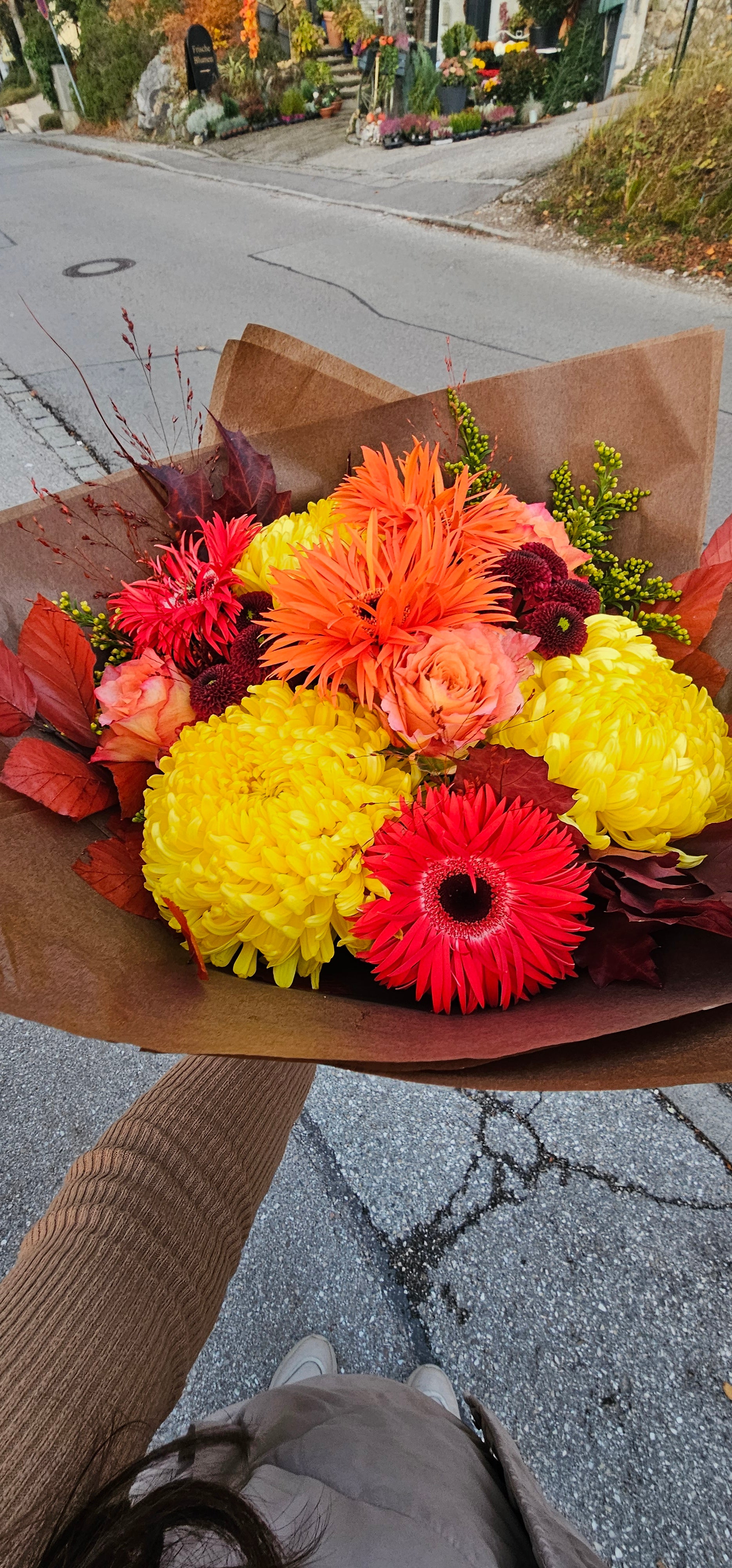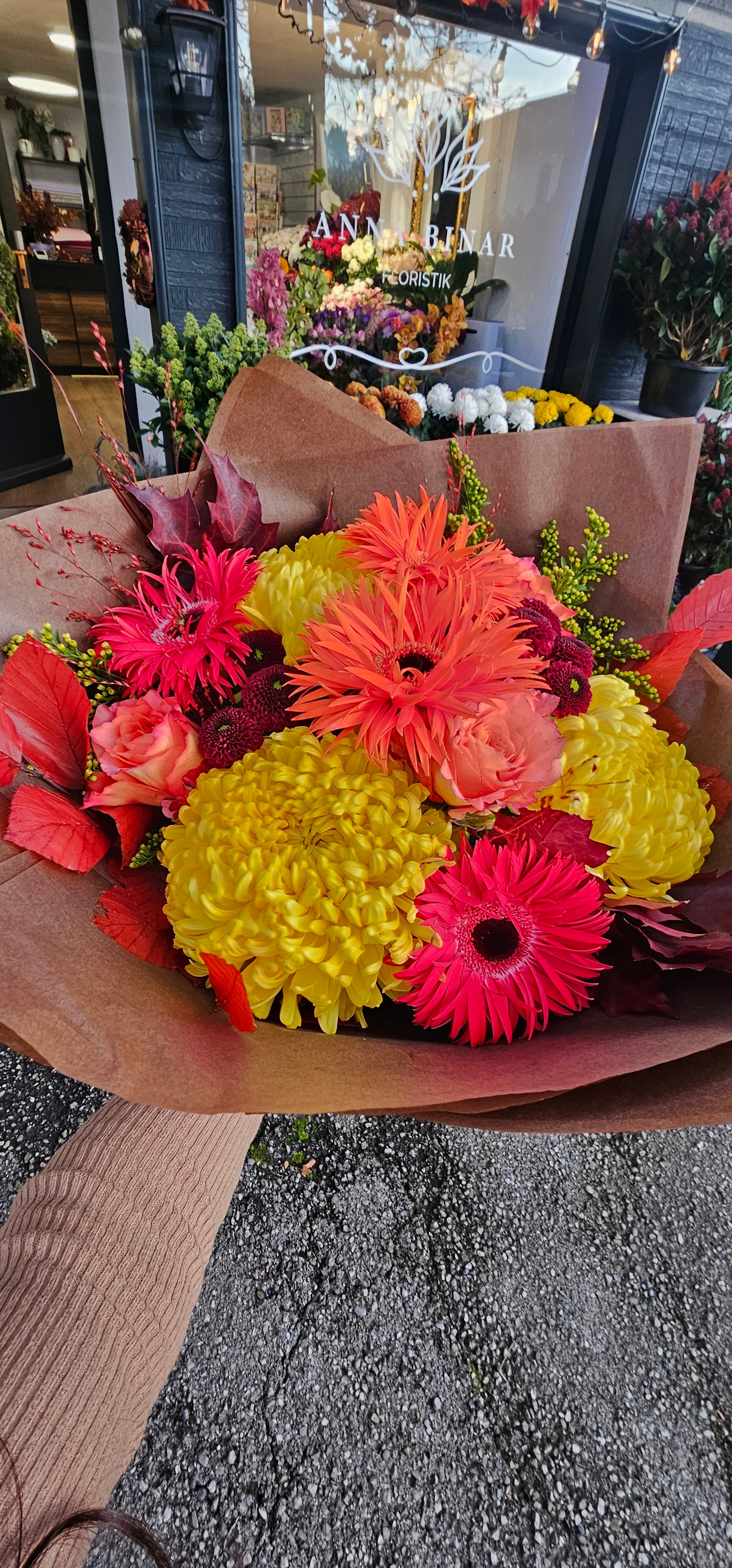 Ein lebendiger, kräftiger Herbststrauß, der wie ein Sonnenuntergang leuchtet. Mit großen gelben Chrysanthemen, leuchtend orangefarbenen Gerbera, pinken Akzenten, Rosen in Pfirsichtönen und roten Blättern bringt er pure Energie und Lebensfreude.