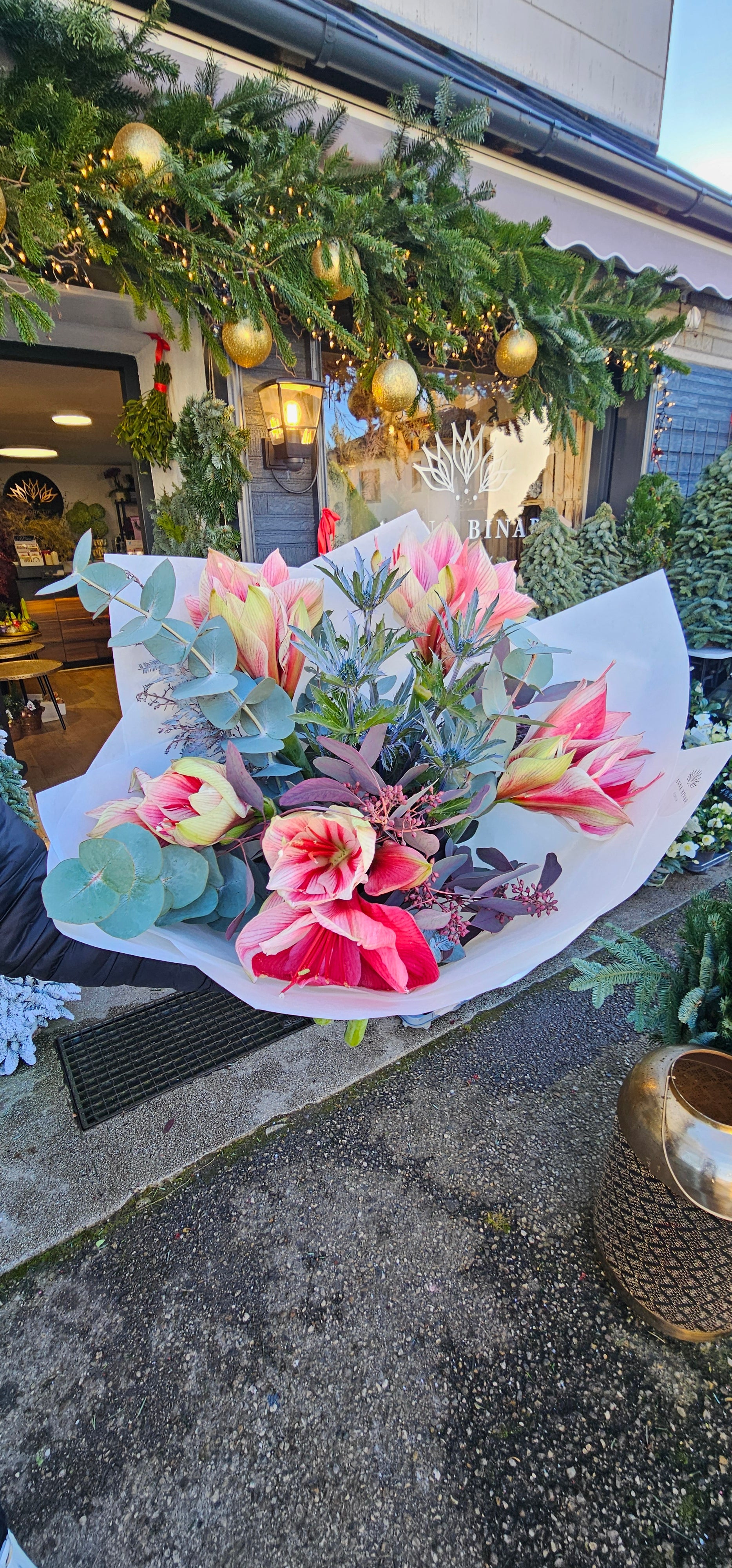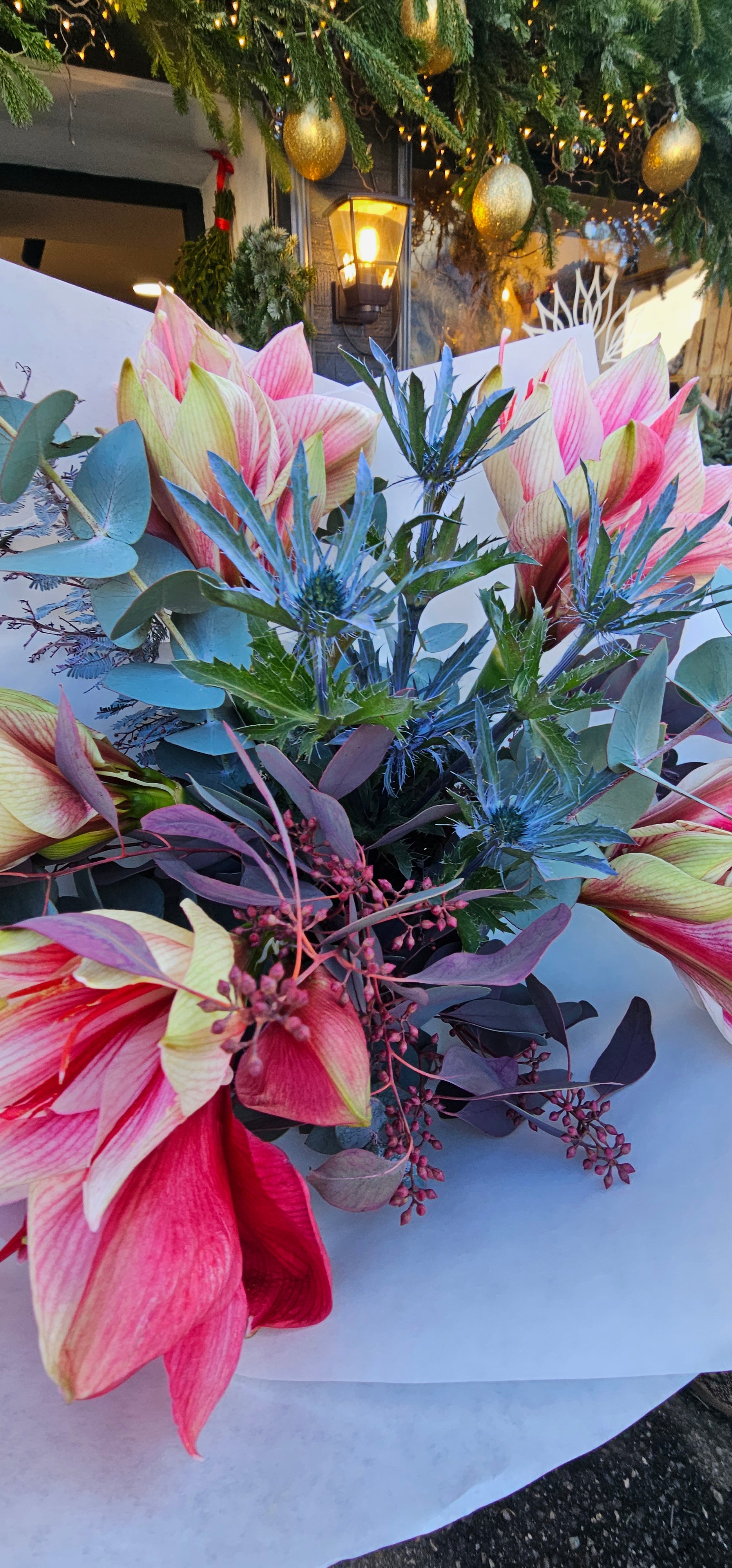 Ein edler und zugleich luftiger Winterstrauß mit zarten Amaryllis in Creme-Rot, winterlichen Disteln (Eryngium), silbergrünem Eukalyptus und violett getönten Beeren. Verpackt in transparentes weißes Papier strahlt dieser Strauß winterliche Frische, Ruhe und Raffinesse aus.