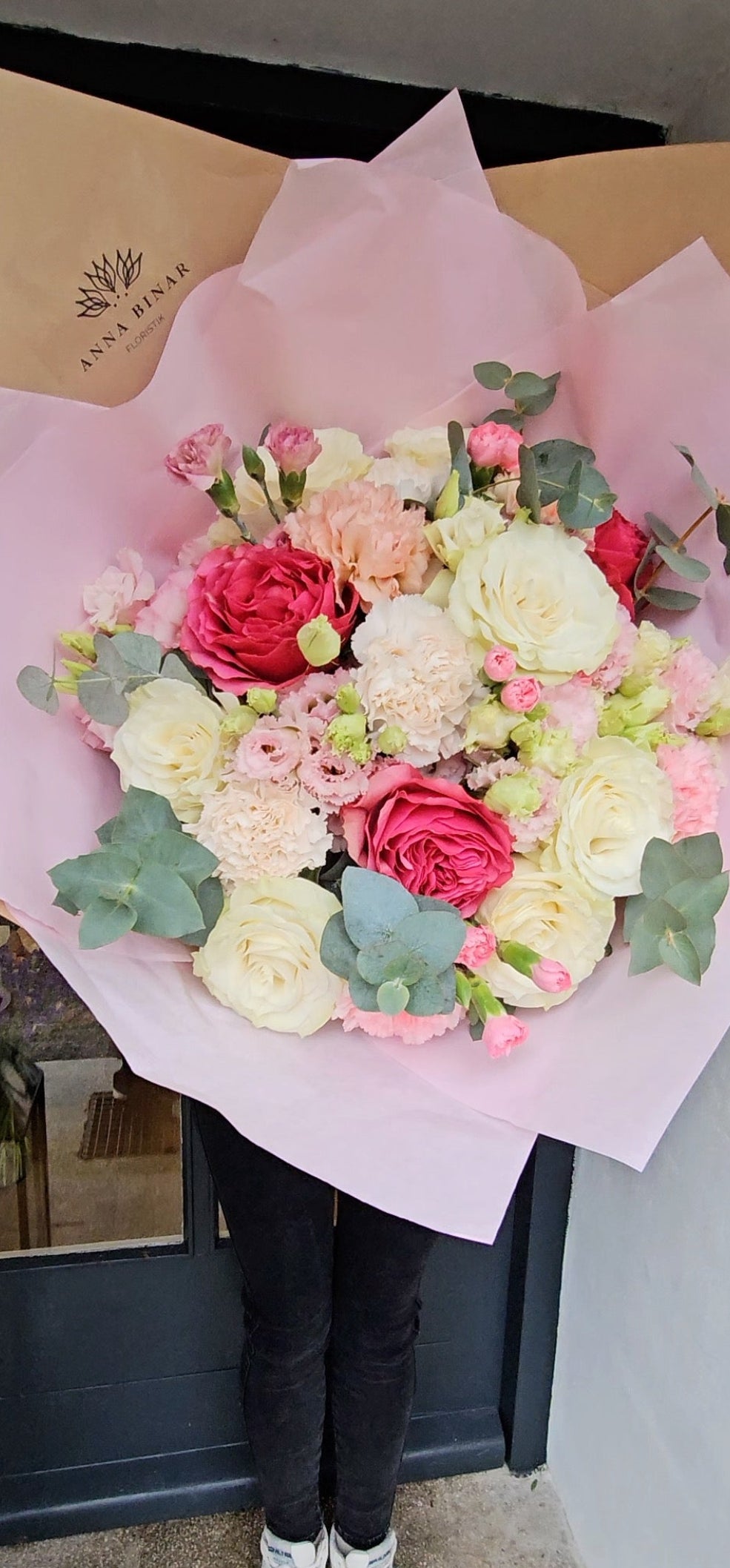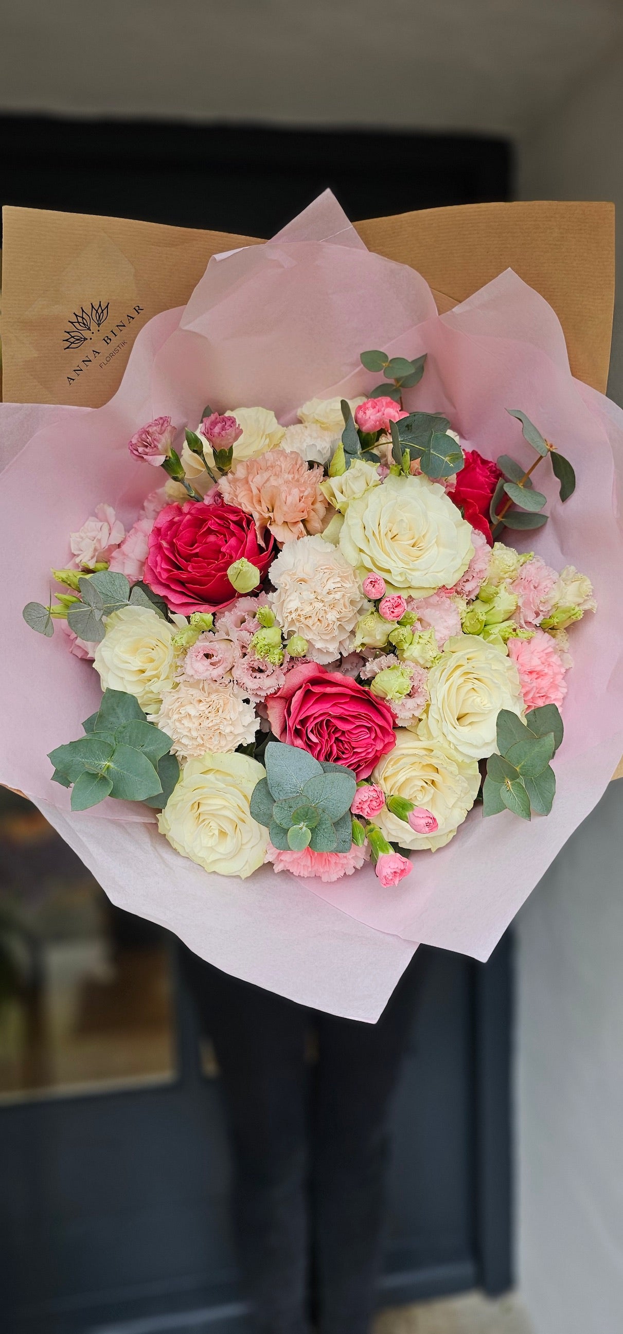 Ein harmonischer, liebevoll gebundener Blumenstrauß mit cremefarbenen Rosen, kräftigen rosa Pfingstrosenrosen, fluffigem Lisianthus und pudrigen Nelken. Eukalyptusblätter sorgen für einen frischen Kontrast.
