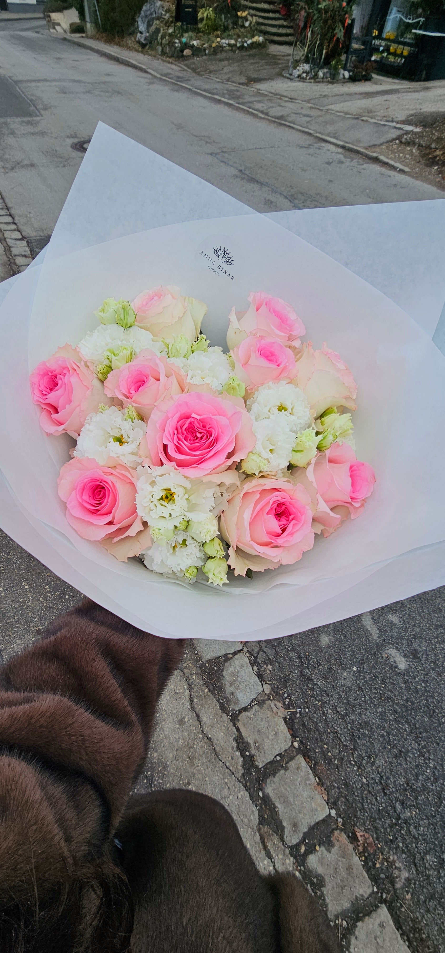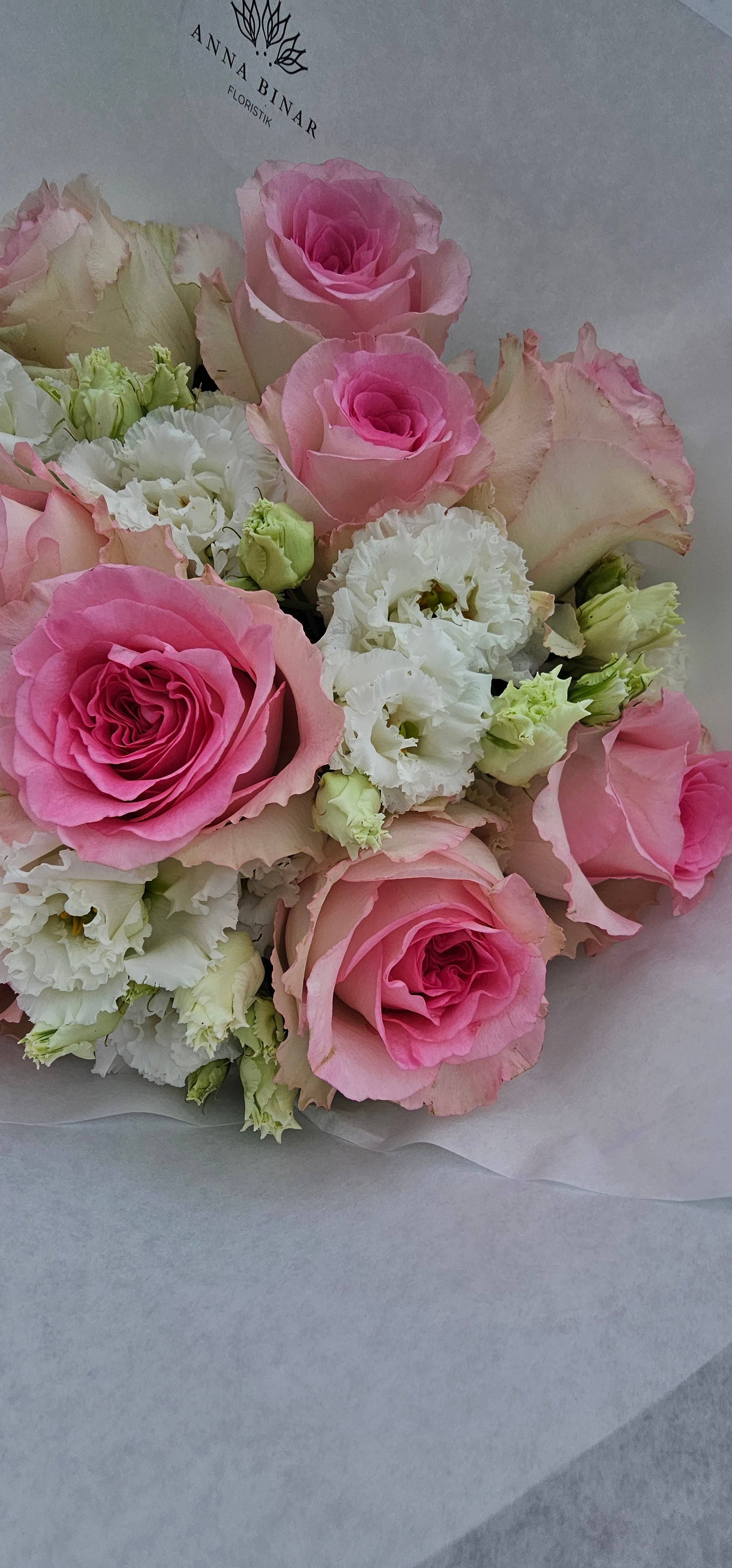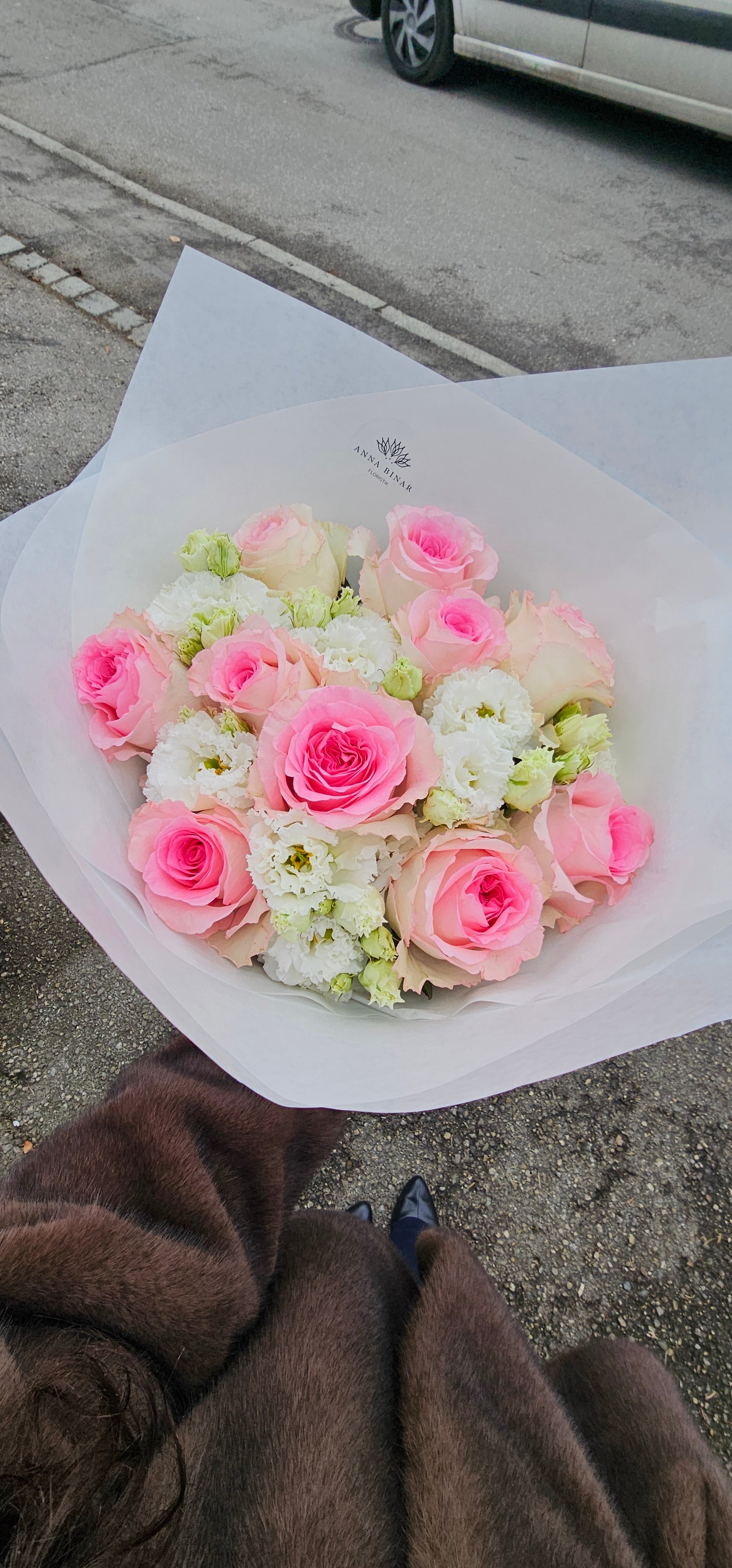 Zarter Premium-Strauß aus rosafarbenen Rosen, weißen Blüten und frischen Akzenten, stilvoll verpackt in edlem Rosé. Perfekt für besondere Anlässe und liebevolle Gesten.