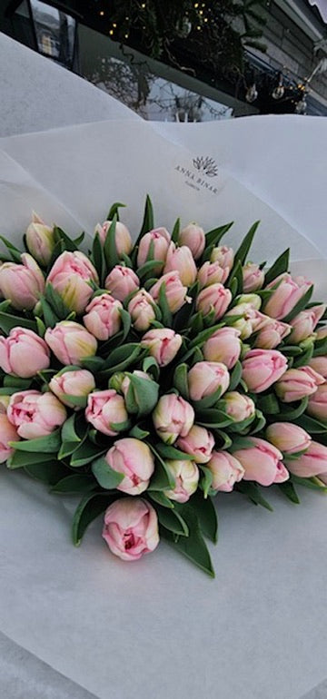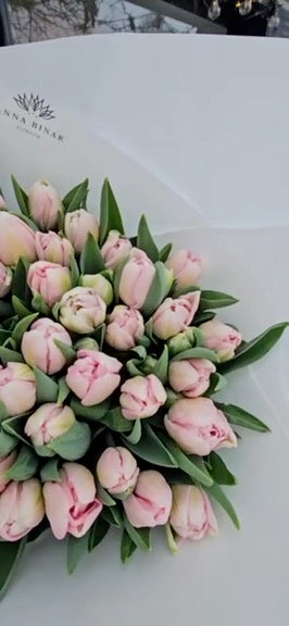 Dieses Bouquet vereint sanfte Rosétöne mit frischem Grün und überzeugt durch seine dicht gefüllten, voluminösen Blüten. Die Tulpen wirken edel, weich und zugleich modern – ein zeitloser Klassiker in luxuriöser Ausführung.
