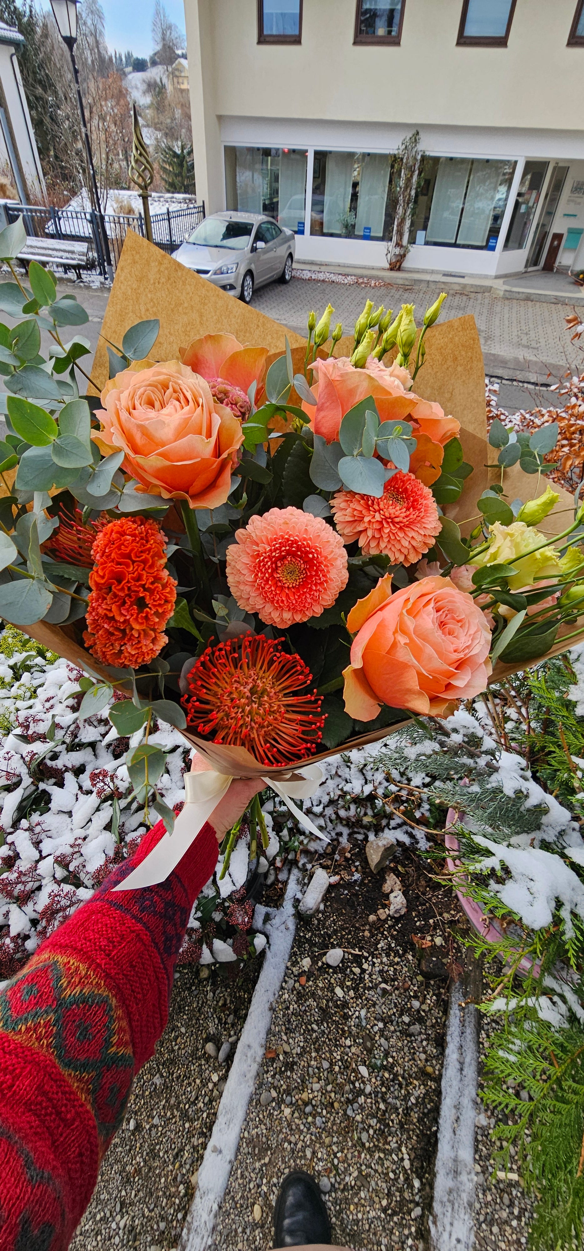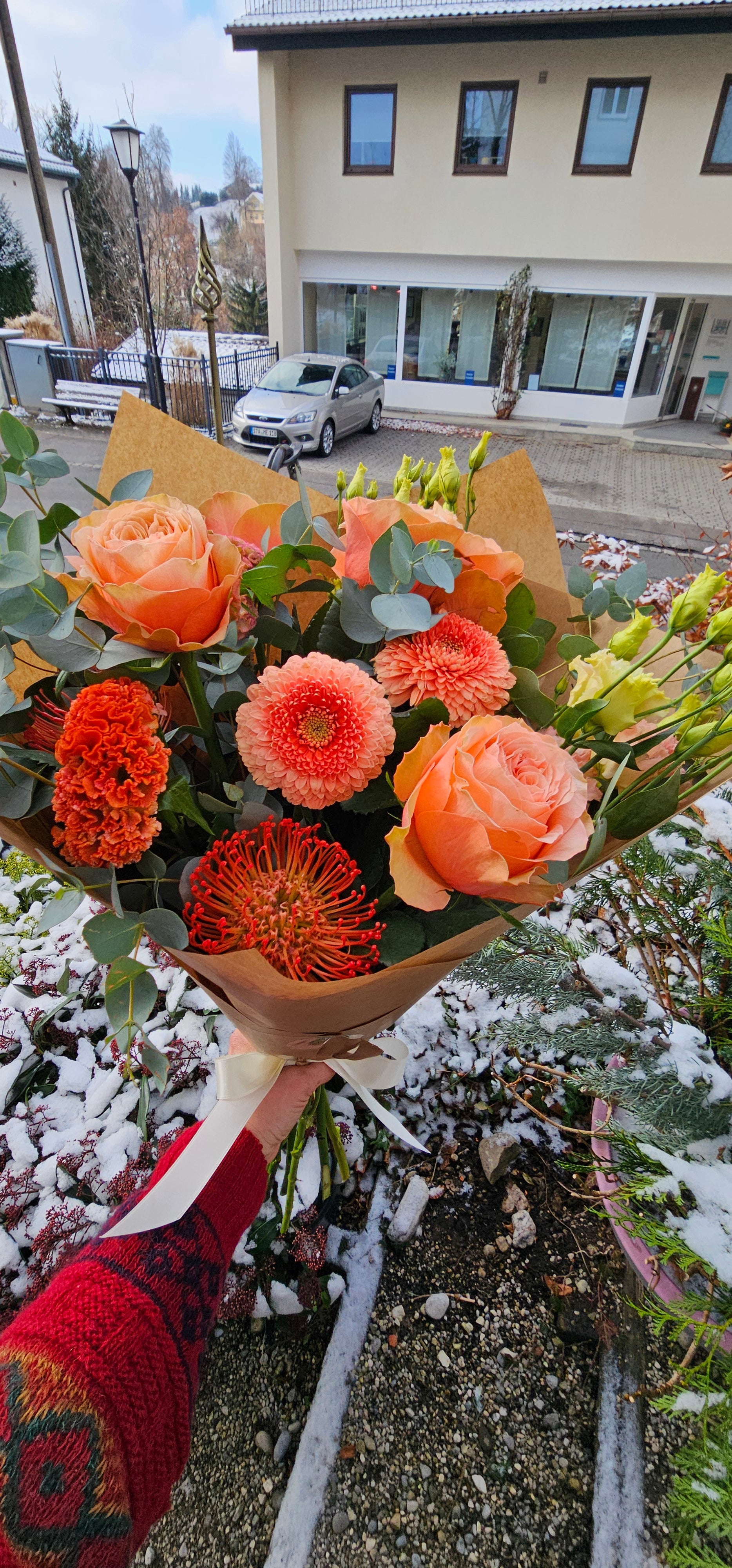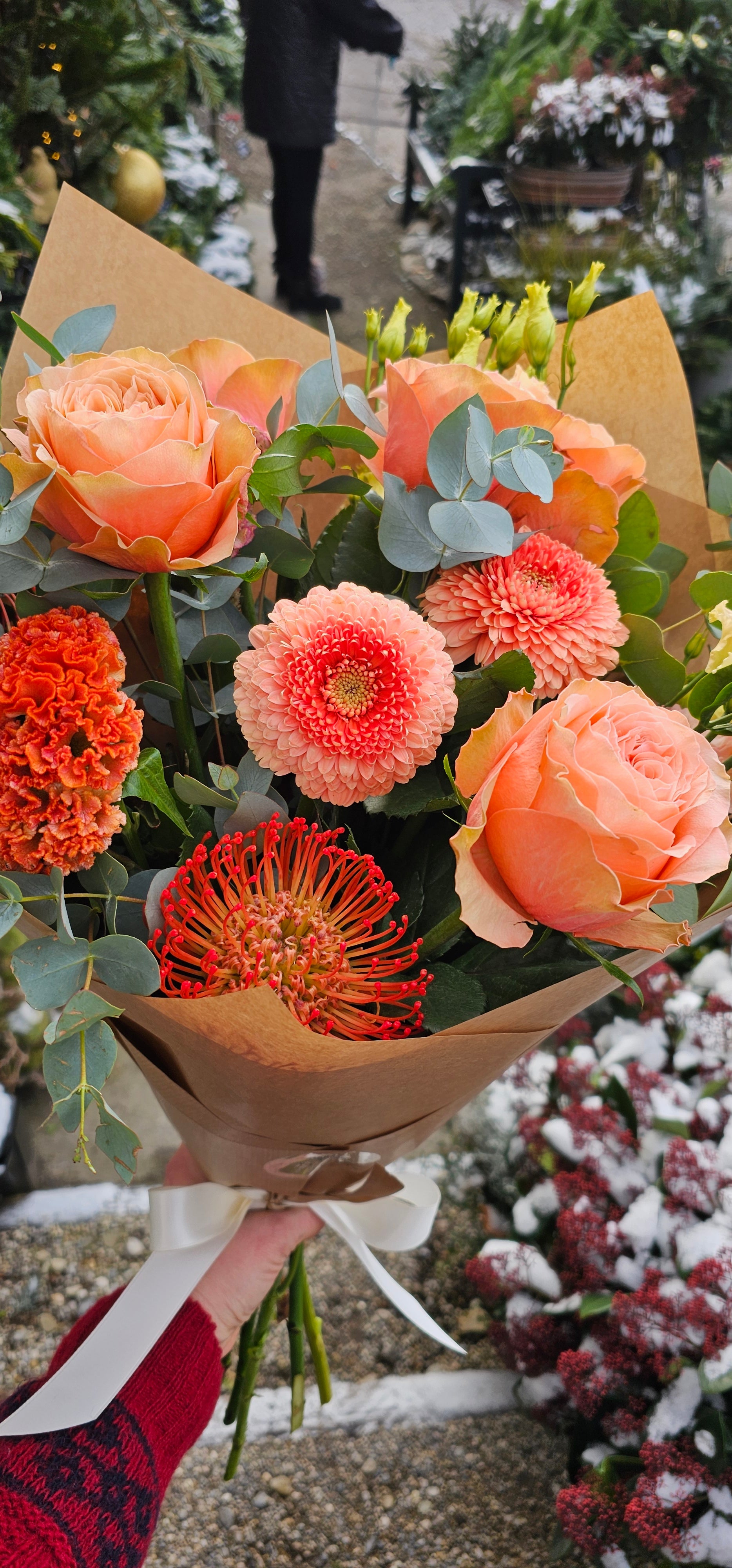Ein frischer, lebendiger Strauß in warmen Pfirsich- und Koralltönen. Edle Rosen, verspielte Gerbera, außergewöhnliche Celosia und leuchtende Protea verleihen diesem Bouquet Energie und Ausdruckskraft. Ergänzt durch Eukalyptus entsteht ein moderner, harmonischer Strauß, der Lebensfreude ausstrahlt. Ideal als Geschenk, um den Tag eines geliebten Menschen zu verschönern.