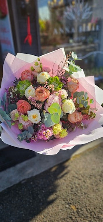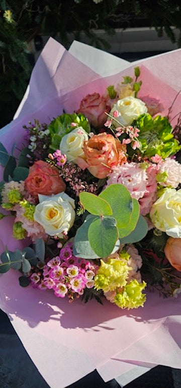 Ein frischer, sonniger Strauß mit Aprikosenrosen, cremefarbenen Ranunkeln, Lisianthus, Eukalyptus und saisonalen Blüten – verpackt in zartrosanem Papier.